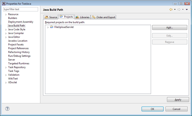 3. Right click your Web Project, and select Properties. Under “Java Build Path”, add reference in the Projects tab to the “FileUploadServlet” project.